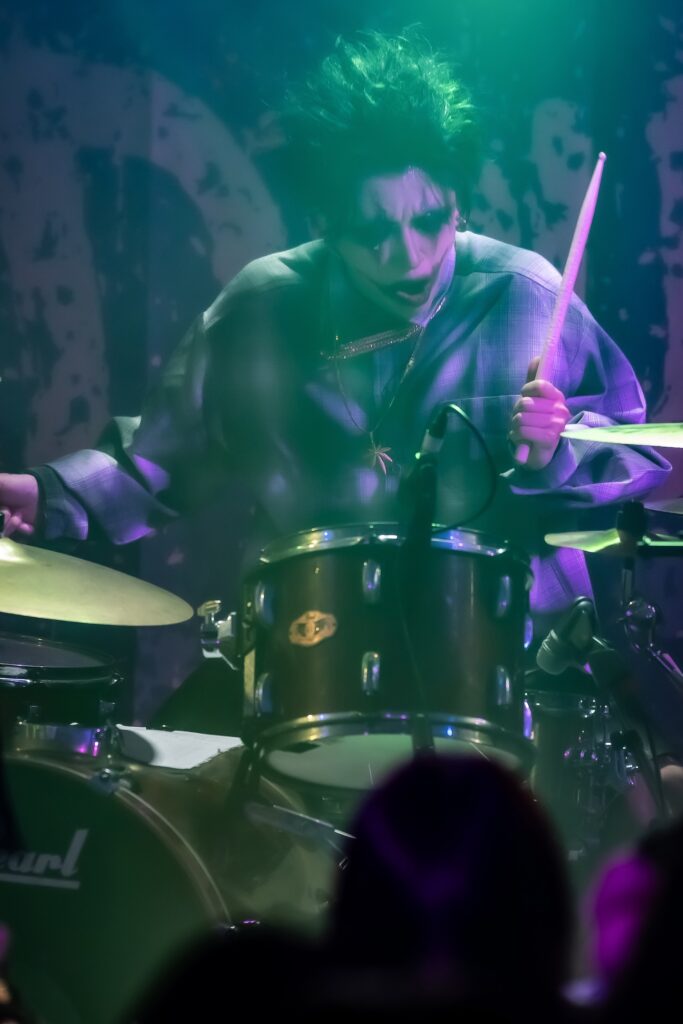 先攻は、DRUGS。バンドを象徴するカラーであるグリーンの照明に包まれながらメンバーが登場。2025年12月に始動したばかりのバンドであるため、この日が初見だというオーディエンスも多いかもしれない。SEが鳴り止み始まった1曲目の『悪魔』では、鋭さと湿度を帯びたサウンドがフロアをじわりじわりと這うように広がりを見せ、そこに重なる綴(Vo)の押し殺した囁き声が、これから何かが起きることを予感させる。その緊迫感を引き裂いたのは、雷鳴さながらのシャウト。まさに「悪魔の降臨」だ。