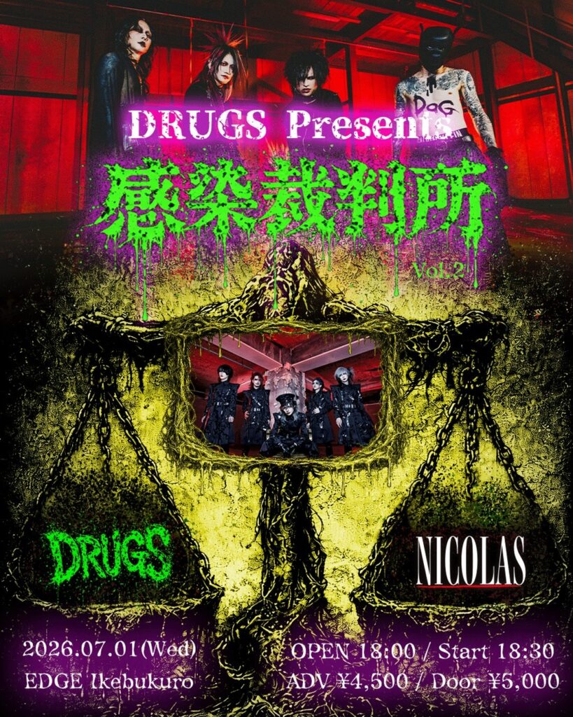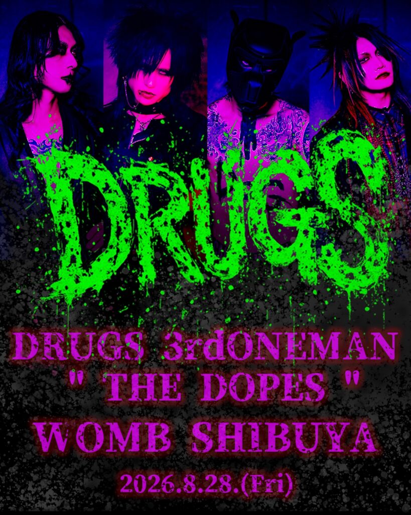 今後の彼らはというと、DRUGSは8月28日(金)に渋谷WOMBで開催される3rd ONE MAN LIVE「THE DOPES」に向けて、精力的な主催2マンを開催する。