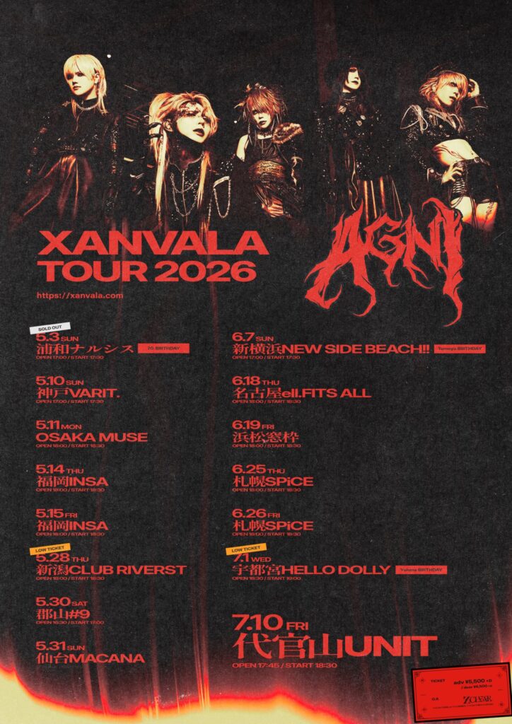 一方のXANVALAは、5月3日(日・祝)の浦和ナルシス公演『70.生誕祭2026』を皮切りに、7月10日(金)のツアーファイナル・代官山UNITを終着地として全国ツアー“AGNI”へと漕ぎ出す。もし彼らがあなたの街を訪れたなら、その圧倒的な勢いの目撃者——いや、共に各地で熱狂の火を灯す“共犯者”となってほしい。