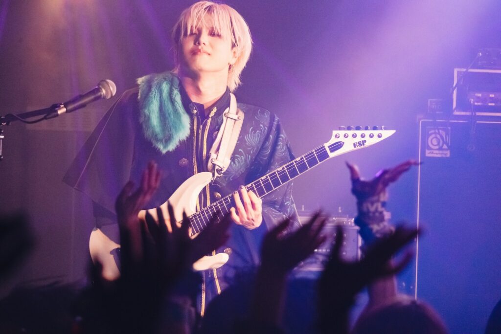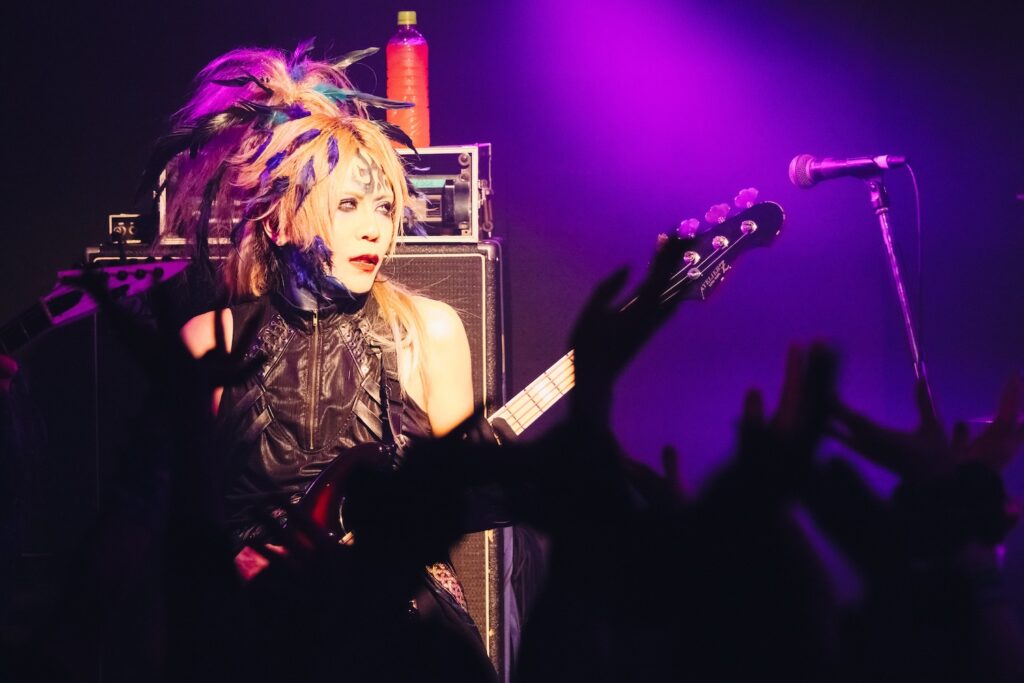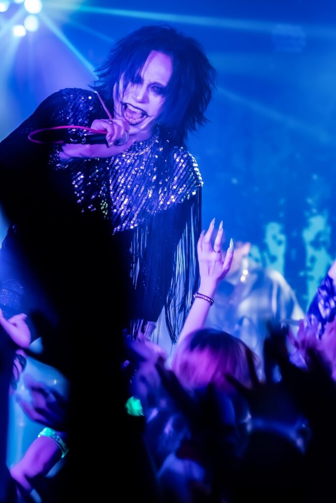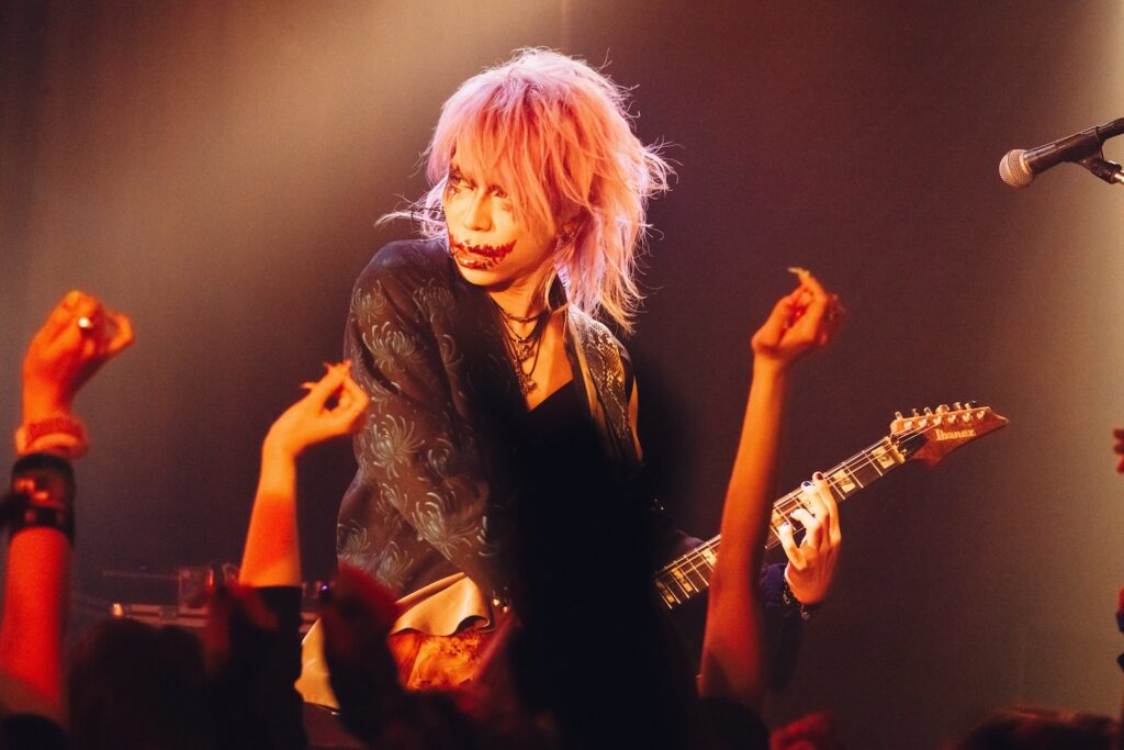 「俺のことぶっ刺しに来てください。それくらい楽しみでした!」と始まったのは、ダンサブルな『エンジェル・ドロップ』、雨の中で噛み締める悲しみを描いた『ジャノメ』、ゴリゴリの重低音の中にYuhmaの澄んだアルペジオが染み渡る『ヴァジュラ』と、会場はフルアクセル。そこから空気をガラッと変えたのは『冥冥』のドロリとしたダークサウンド。しかしそれだけにとどまらず、遠くから聞こえる「カンカンカン……」という遮断機の音と左右に点滅する赤いライト、迫り来る電車の音が緊張感を生む中『ケ・セラ・セラ』がさらなる熱狂へと導く。