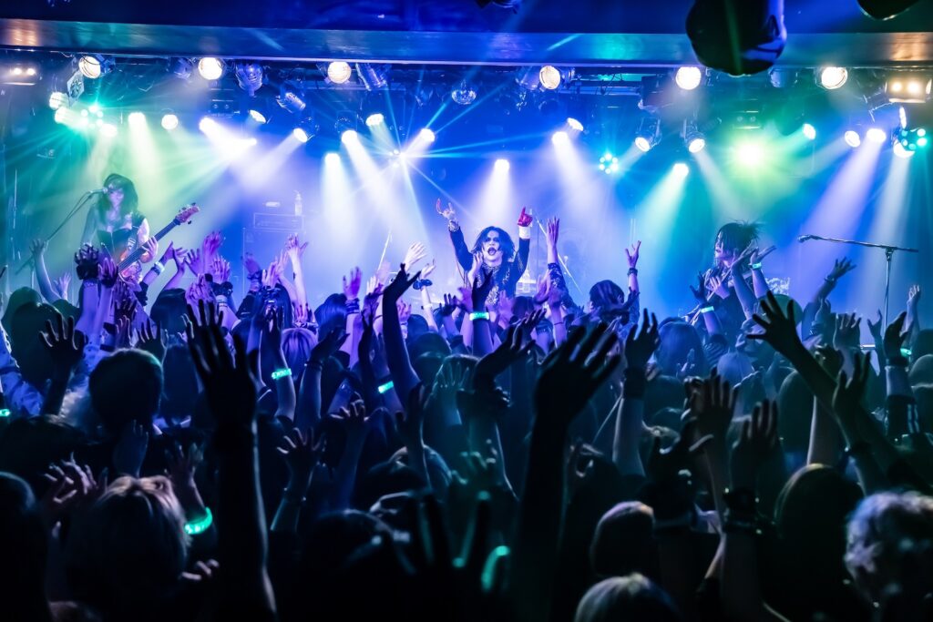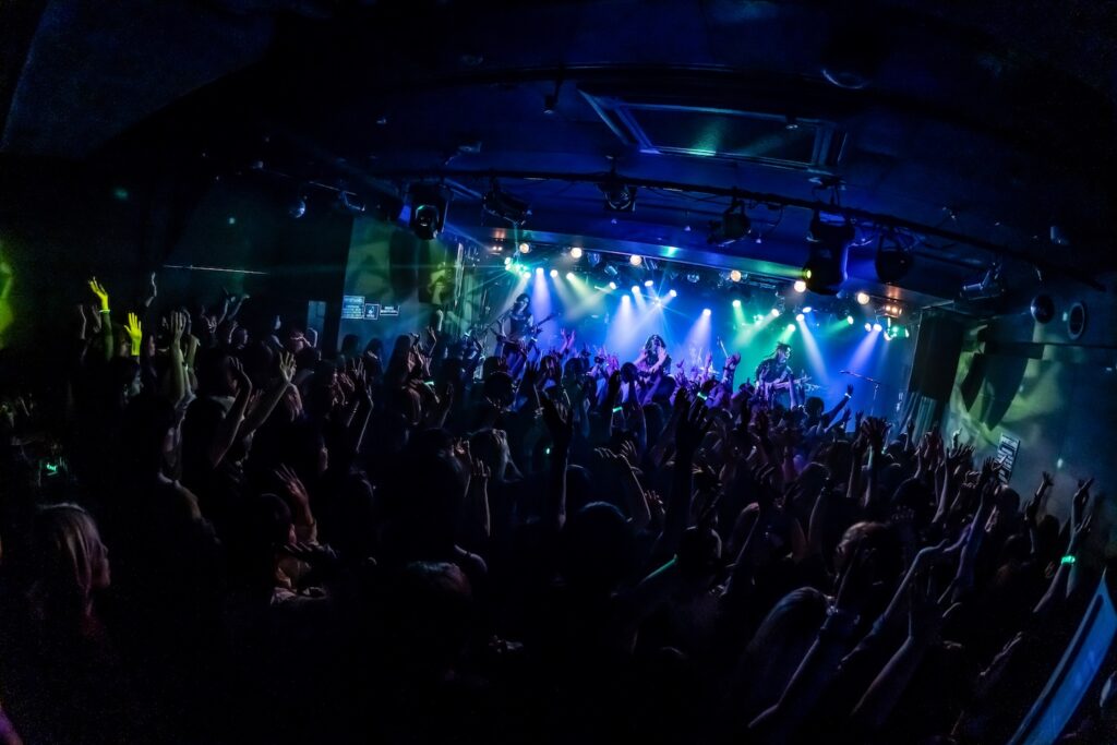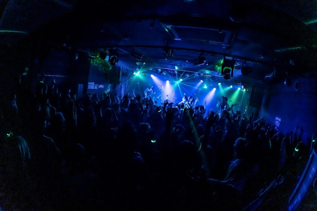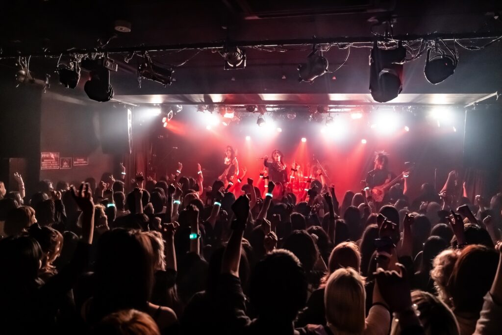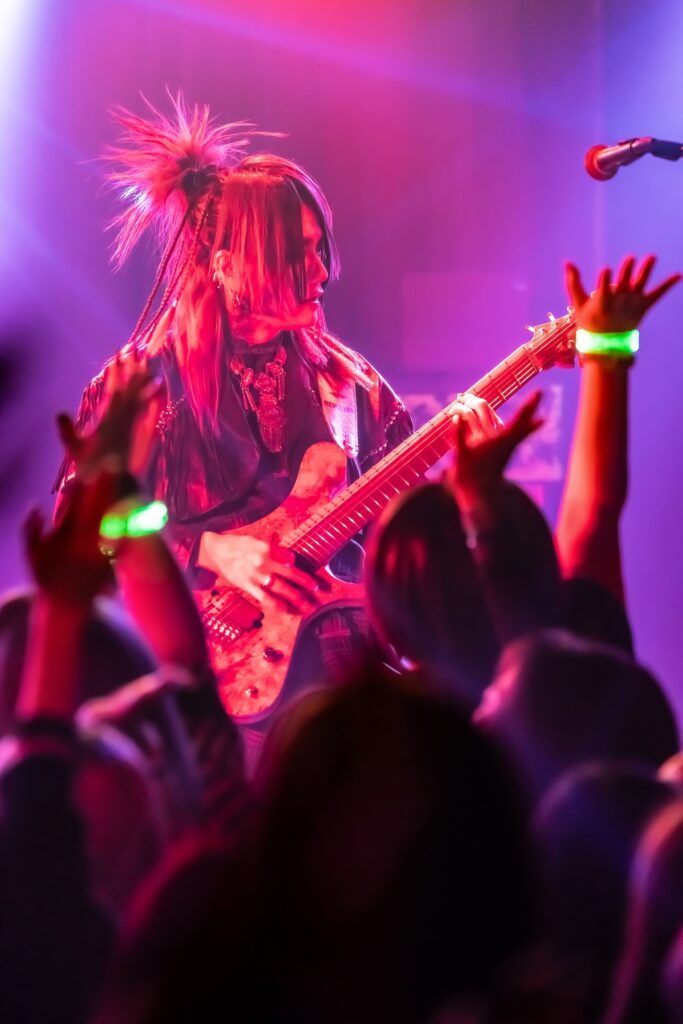 「俺のことぶっ刺しに来てください。それくらい楽しみでした!」と始まったのは、ダンサブルな『エンジェル・ドロップ』、雨の中で噛み締める悲しみを描いた『ジャノメ』、ゴリゴリの重低音の中にYuhmaの澄んだアルペジオが染み渡る『ヴァジュラ』と、会場はフルアクセル。そこから空気をガラッと変えたのは『冥冥』のドロリとしたダークサウンド。しかしそれだけにとどまらず、遠くから聞こえる「カンカンカン……」という遮断機の音と左右に点滅する赤いライト、迫り来る電車の音が緊張感を生む中『ケ・セラ・セラ』がさらなる熱狂へと導く。