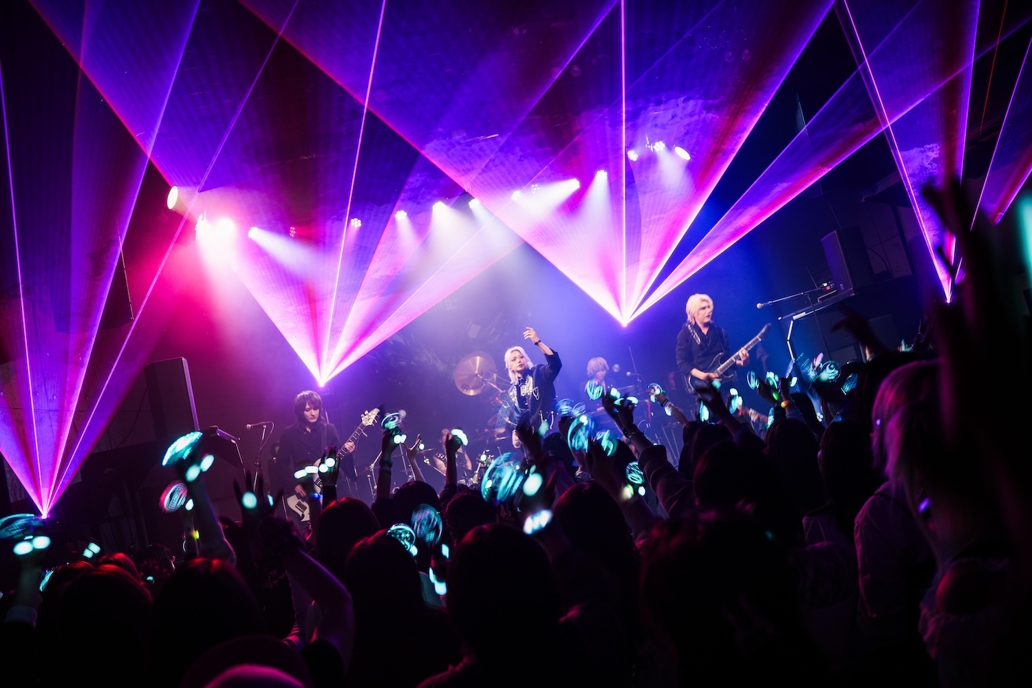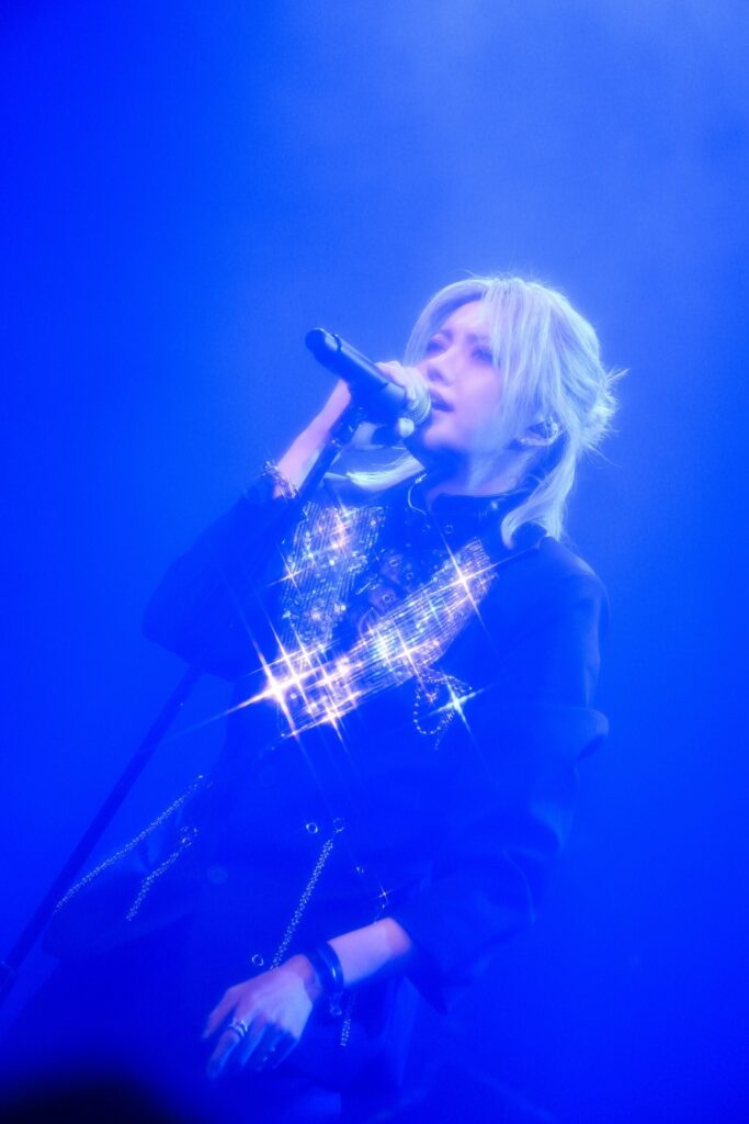 その華麗なイメージを破壊するように「行くぞ、東京!」とShouがフロアを煽り、ライブは「Nightglow/」で勢いよく幕開け。場内にはレーザービームが無尽に飛び交い、バンドは緊迫感あるヘヴィでラウドな重低音サウンドを奏でていく。Shouはその重たい闇を切り裂き、未来の光をつかむように力強いヴォーカルを会場に向かって解き放つ。高身長揃いのメンバーの存在感もすごいが、それ以上にVerde/のバンドサウンド、ヴォーカルが放つエネルギーはダイナミックで迫力満点! 鼓膜をダイレクトに直撃して、観客たちをVerde/サウンドに没入させていく。