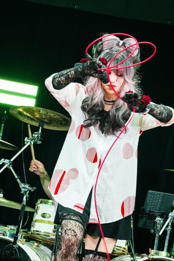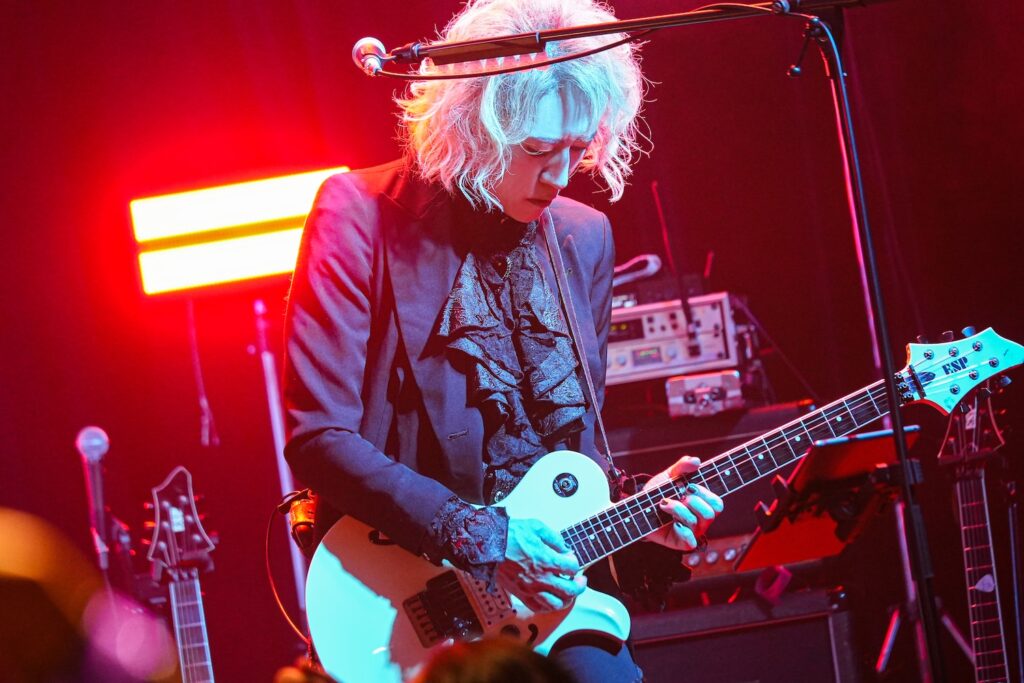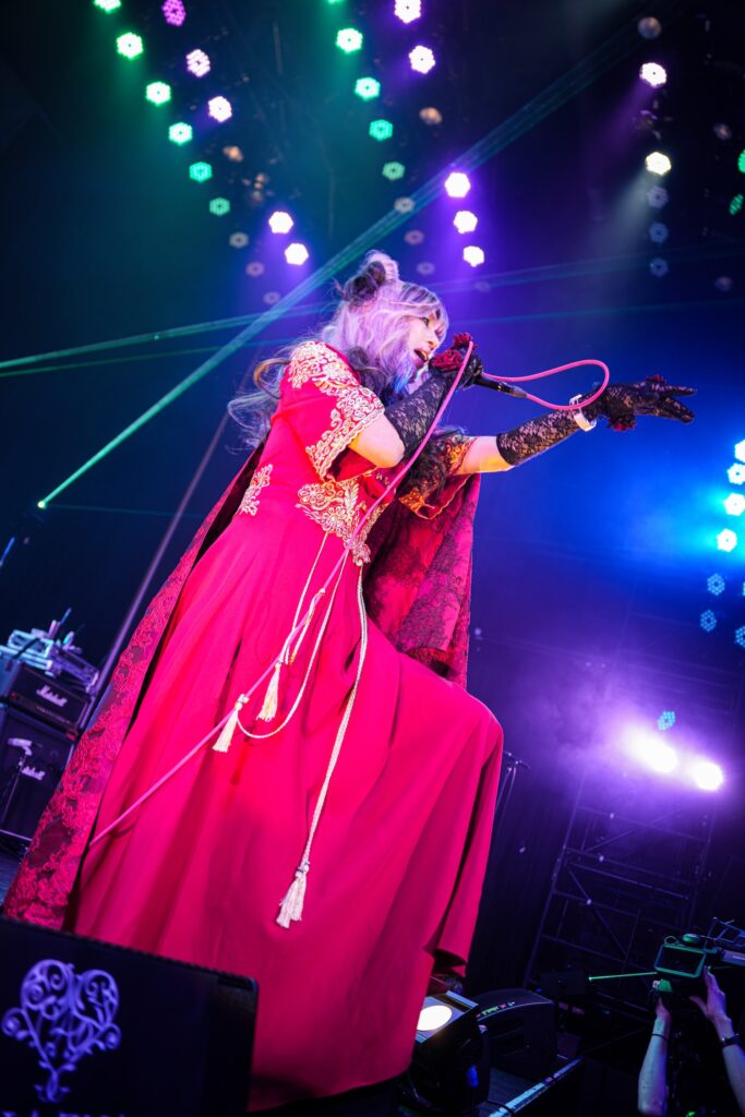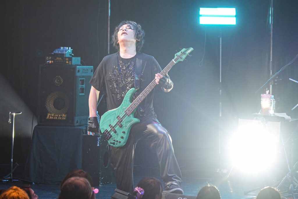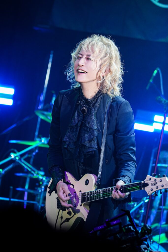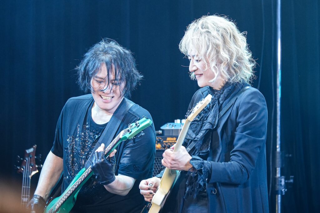 ドラムカウントを合図に、A・O・Iのギターの音が荒々しく火を吹いた。復活後のライブでは欠かさずに演奏をしてきた、最新アルバム『参華三釼』のリード曲の『一角獣-モノケロス-』だ。攻めたスリリングな楽曲ながら、心地よい高揚感も心と身体に与えるのが嬉しい。甘い声で響かせたメロウなサビ歌が、心をとろけさせる。でも、終始演奏は攻め続けるからこそ、掲げた手を大きく振り続けていたい。冒頭から飛び交っていた無数のレーザーの光も、この日のライブに華やかさを与えていた。サビを歌うIZAMの声に合わせて、場内中で無数の手の花が大きく揺れる景色が壮観だ。刺々しくも甘辛い衝撃に、早くも落ちてしまいそう。