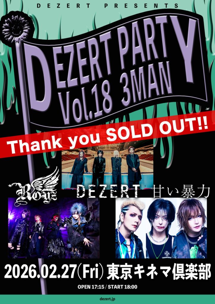 DEZERT PARTY Vol.18 東京キネマ倶楽部 2026年2月27日(金) OPEN 17:15 / START 18:00 DEZERT/Royz/甘い暴力 【チケット料金】 オールスタンディング ¥6,600(税込) SOLD OUT!! ※入場時ドリンク代別途必要 ※営利目的の転売禁止 ※未就学児童入場不可
