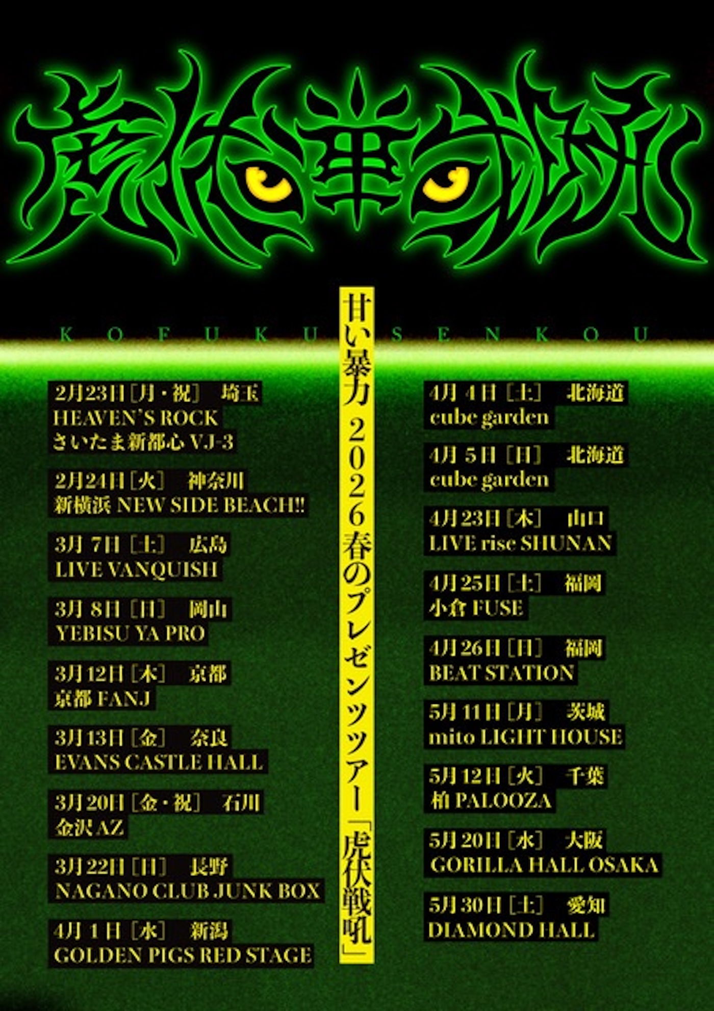 甘い暴力 春のプレゼンツツアー 「虎伏戦吼」 【埼玉】2月23日(月・祝) HEAVEN’S ROCKさいたま新都心 SOLD OUT!! 【神奈川】2月24日(火) 新横浜NEW SIDE BEACH!! SOLD OUT!! 【広島】3月7日(土) LIVE VANQUIS 【岡山】3月8日(日) YEBISU YA PR 【京都】3月12日(木) 京都FANJ 【奈良】3月13日(金) EVANS CASTLE HALL 【石川】3月20日(金・祝) 金沢AZ 【長野】3月22日(日 【新潟】4月1日(水) GOLDEN PIGS RED STAGE 【北海道】4月4日(土) cube garden 【北海道】4月5日(日) cube garde 【山口】4月23日(木) LIVE rise SHUNA 【福岡】4月25日(土) 小倉FUSE 【福岡】4月26日(日) BEAT STATION 【茨城】5月11日(月) 水戸LIGHT HOUSE 【千葉】5月12日(火) 柏PALOOZA 【大阪】5月20日(水) GORILLA HALL 【愛知】5月30日(土) DIAMOND HALL ----------------------------------- 4月4日 北海道〜5月30日 愛知公演 1次プレオーダー受付中 2026/2/4(水)12:00~2026/2/17(火)23:59 https://eplus.jp/sf/word/0000102353 ----------------------------------- 新潟公演まで一般発売中! オールスタンディング 6,000円(税込) ※入場時にドリンク代が別途必要となります。 イープラス https://eplus.jp/sweetviolence-2026spring-1/ チケットぴあ https://w.pia.jp/t/sweet-violence/ ローチケ https://l-tike.com/sweet-violence/